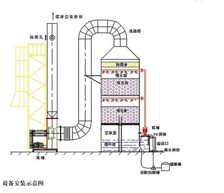 應(yīng)根據(jù)使用情況定期檢查塔體底部?jī)?chǔ)液池內(nèi)液體酸堿度、飽和度及排氣口氣體凈化程度,超過(guò)排放標(biāo)準(zhǔn)參數(shù)時(shí),應(yīng)更換底部?jī)?chǔ)液池中或者沉淀池中的藥水吸收液。