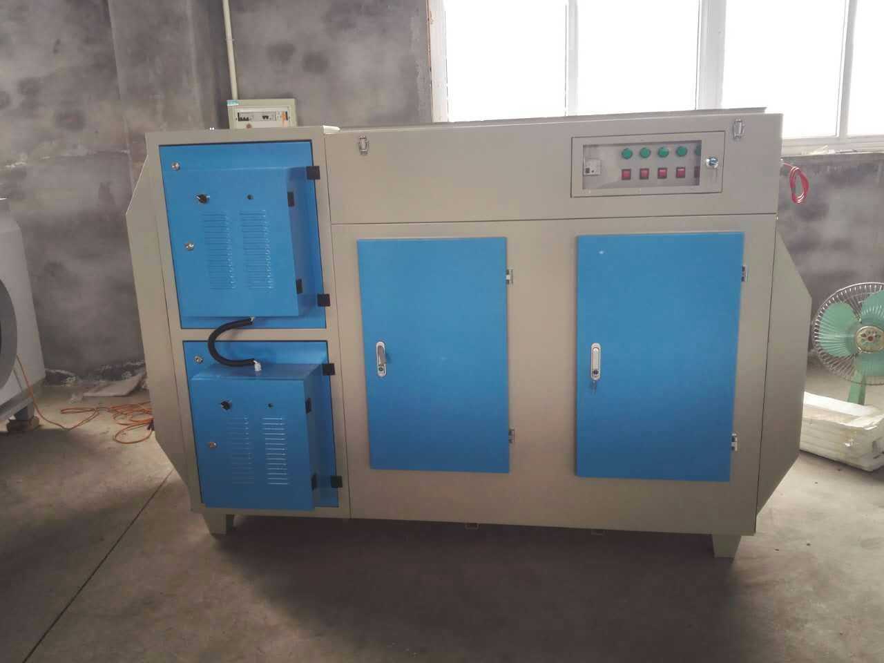 3、主機(jī)為成套工業(yè)廢氣處理裝置,前面配有專用塔,能有效去除廢氣中的粉塵和水分,操作簡單